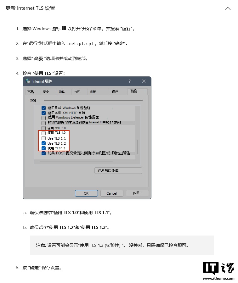 检查“使用 TLS”设置:确保取消勾选“使用 TLS 1.0”和“使用 TLS 1.1”,勾选“使用 TLS 1.2”和“使用 TLS 1.3”。