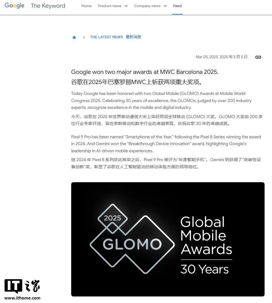 IT之家 3 月 6 日消息,在 2025 年巴塞罗那世界移动通信大会(MWC)上,谷歌公司斩获了全球移动通信系统协会(GLOMO)颁发的两项最具分量的奖项。