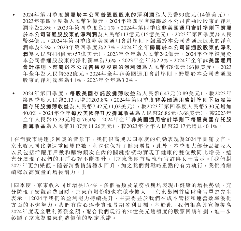 2024 年第四季度归属于普通股股东的净利润为人民币 99 亿元,非美国通用会计准则下归属于公司普通股股东的净利润为人民币 113 亿元。