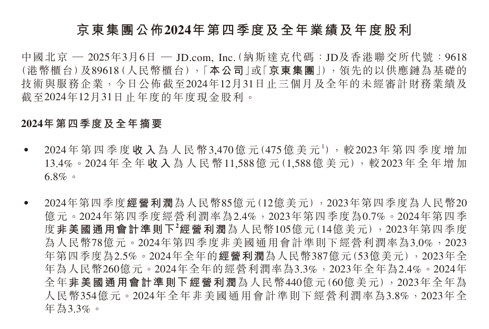 IT之家 3 月 6 日消息,京东集团今日在港交所发布了 2024 年第四季度及全年业绩报告。京东集团 2024 年全年收入为 11588 亿元人民币,同比增长 6.8%;同年第四季度收入为 3470 亿元人民币,同比增长 13.4%。