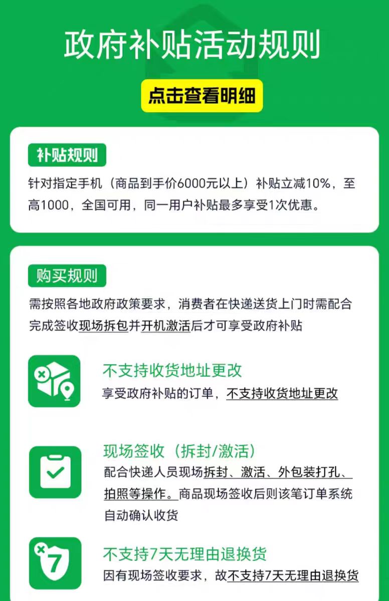 需按照各地政府政策要求,消费者在快递送货上门时需配合完成签收现场拆包并开机激活后才可享受政府补贴。