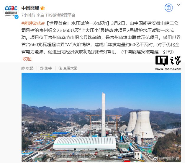 IT之家 3 月 6 日消息,据中国能源建设集团有限公司消息,3 月 2 日,由中国能建安徽电建二公司承建的贵州织金 2×660 兆瓦“上大压小”异地改建项目 2 号锅炉水压试验一次成功。项目位于贵州省毕节市织金县珠藏镇,采用世界首台 660 兆瓦超超临界“W”火焰锅炉,建成后年发电量约 60 亿干瓦时。