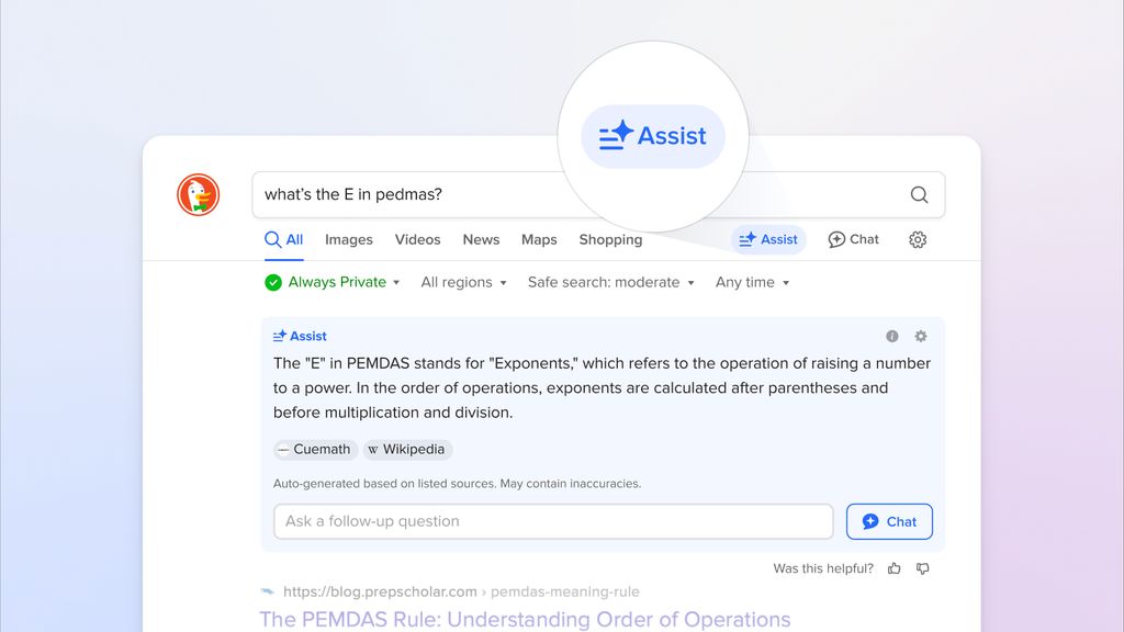 DuckDuckGo 搜索引擎的 AI 功能名为“Assist”,于 2023 年首次推出,经过近 2 年的测试后现已告别 Beta 测试。与 Google 的 AI Overview 类似,Assist 在搜索结果上方提供 AI 生成的摘要。