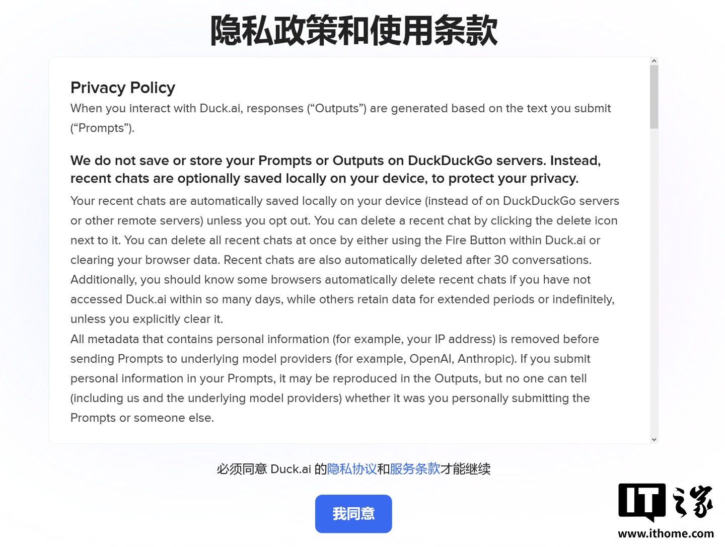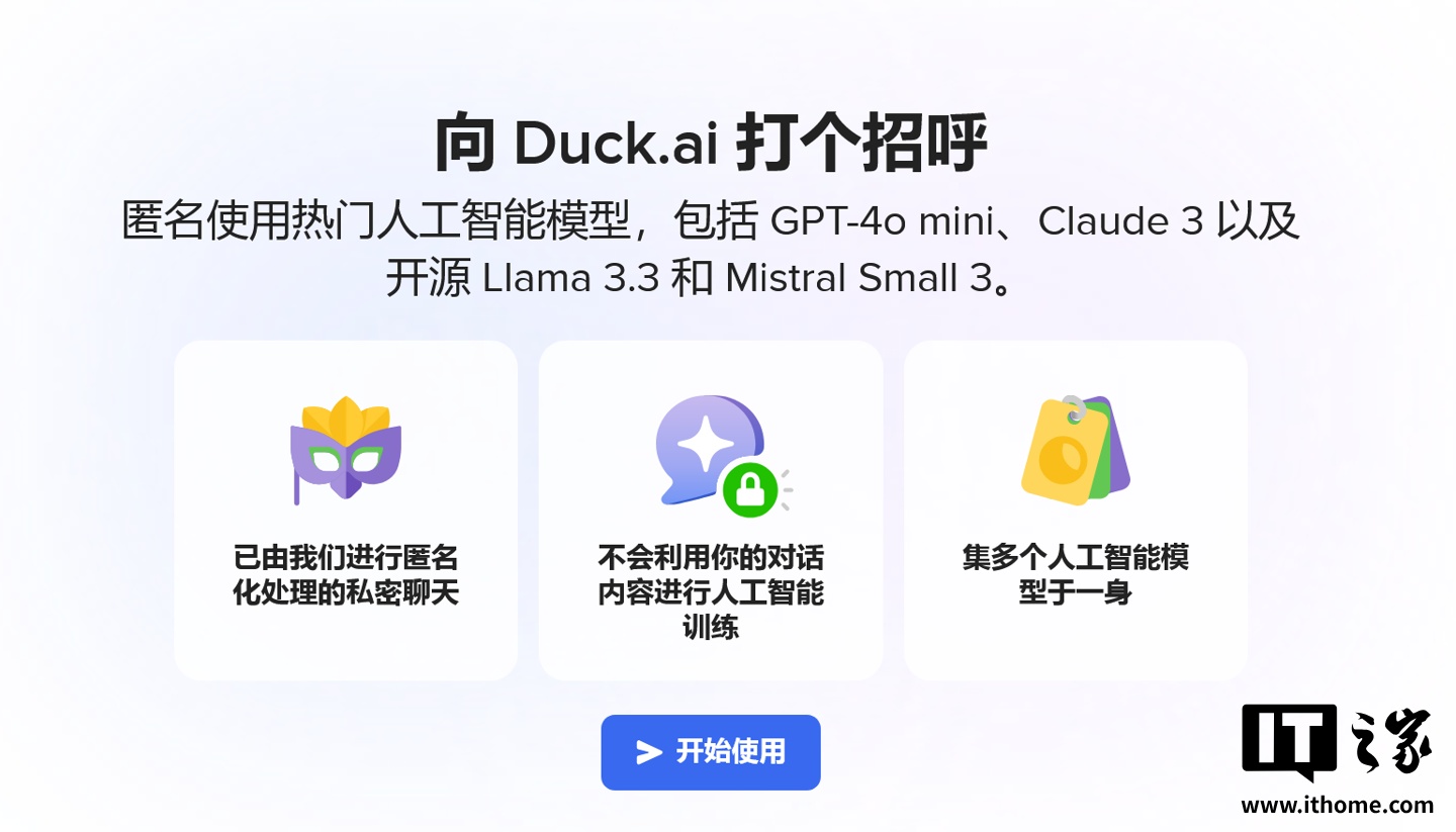 IT之家援引博文介绍,官方还同步上线了 Duck.ai 网站,提供免费、私密的 AI 聊天服务,无需账户即可使用,且聊天内容不会用于 AI 模型训练。