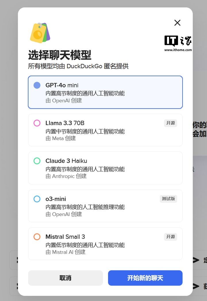 IT之家 3 月 7 日消息,Spread Privacy 官网昨日(3 月 6 日)发布公告,宣布 DuckDuckGo 搜索引擎的 AI 功能已告别 Beta 测试阶段,现已正式上线,用户可自由选择是否启用 AI 辅助搜索和聊天功能。
