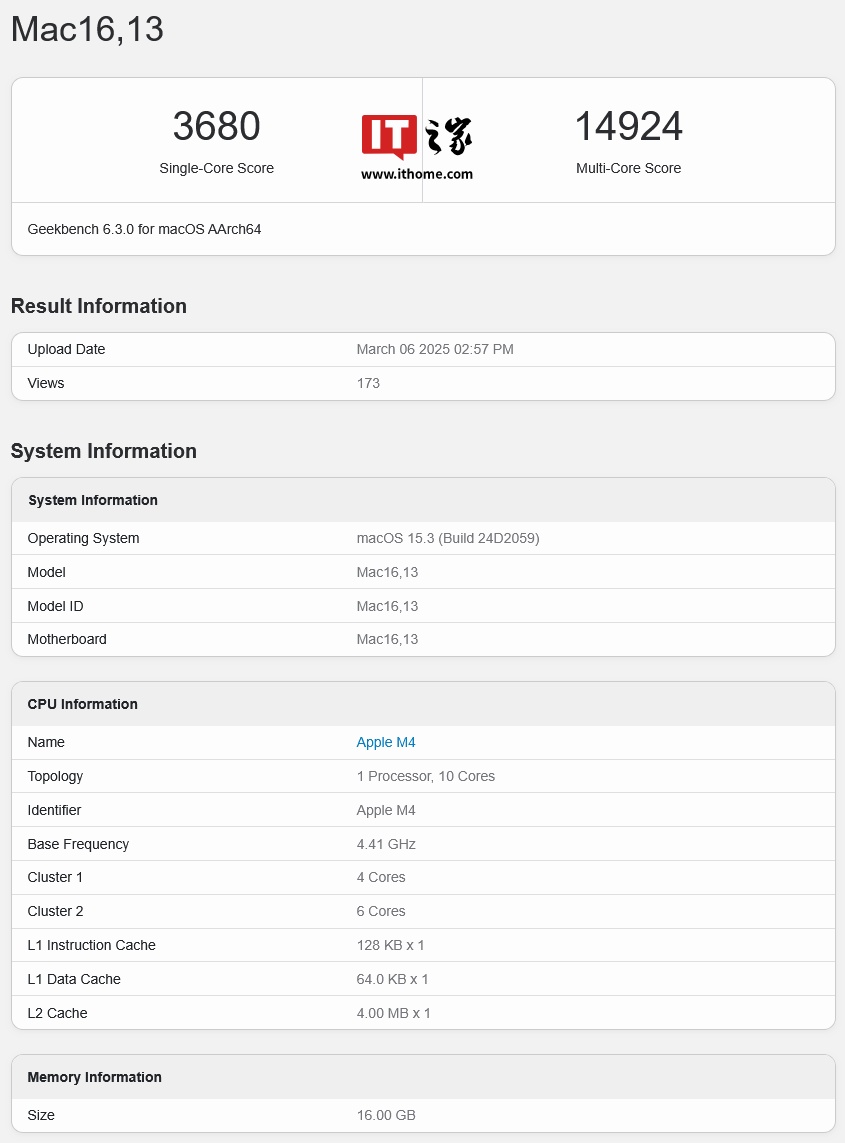 2025 款 M4 MacBook Air 笔记本已现身 GeekBench 跑分库,6.3.0 版本单核成绩为 3680 分,多核成绩为 14924 分。芯片跑分提升的一个原因是 M4 的 CPU 核心数量增加:M4 拥有 10 个 CPU 核心,而 M3 只有 8 个。IT之家附上跑分情况如下:
