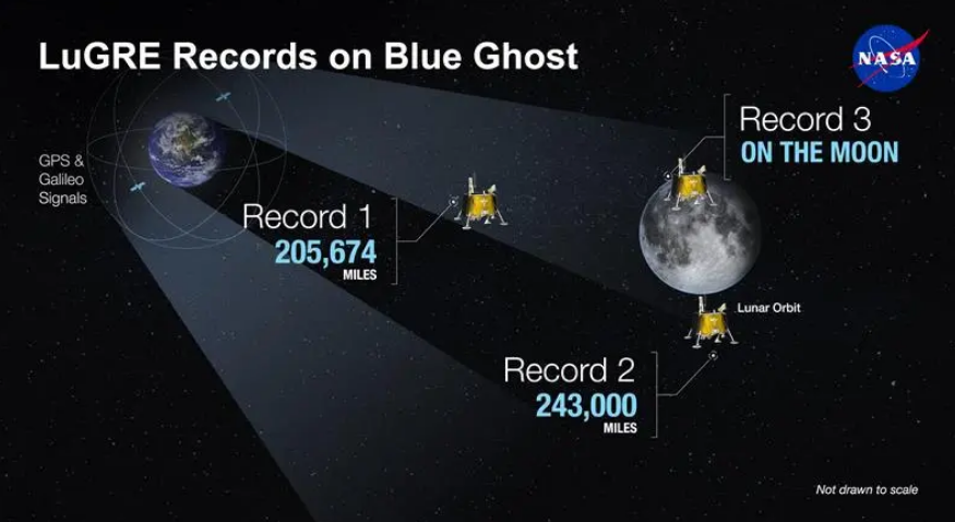 LuGRE 载荷也打破了其前往月球途中的 GNSS 纪录。1 月 21 日,LuGRE 在距离地球 209,900 英里处超越了有史以来最高海拔的 GNSS 信号获取纪录,这一纪录此前由 NASA 的磁层多尺度任务(Magnetospheric Multiscale Mission)保持。