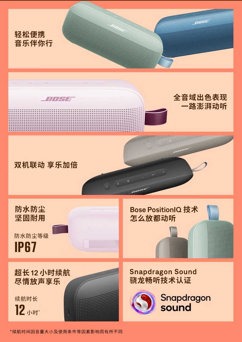 这款新品支持 12 小时续航、双机联动,只需按下快捷方式按钮,就可以连接到另一台 Bose SoundLink Flex 便携式扬声器(第 2 代),提供立体声模式和派对模式。扬声器内置麦克风,与手机连接可以拨打和接听电话,或者用来访问手机语音助手。