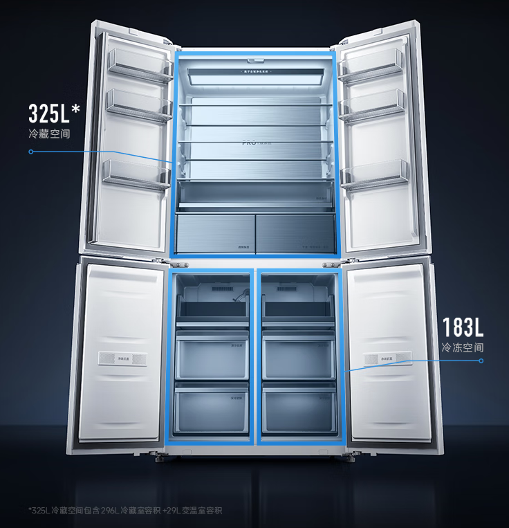 产品内部具有 508L 超大空间,包括 325L 冷藏空间、183L 冷冻空间。冷藏精准控温 < 1°C,智慧控冷系统,感知温度变化并实时调节送风模式。该产品还提供独立变温抽屉,三档变温模式定制专属食材存鲜温度。