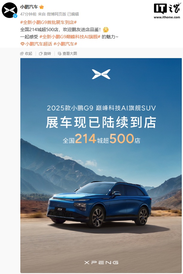 IT之家 3 月 7 日消息,小鹏汽车今日宣布,2025 款小鹏 G9 首批展车到店,全国 214 城超 500 店。