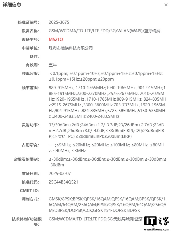 IT之家 3 月 7 日消息,今日,一款型号为 M521Q 的魅族新机通过了工信部无线电核准。目前尚不清楚这款新机的具体型号,根据代号来看,预计为魅蓝 20(M421Q)的继任者。