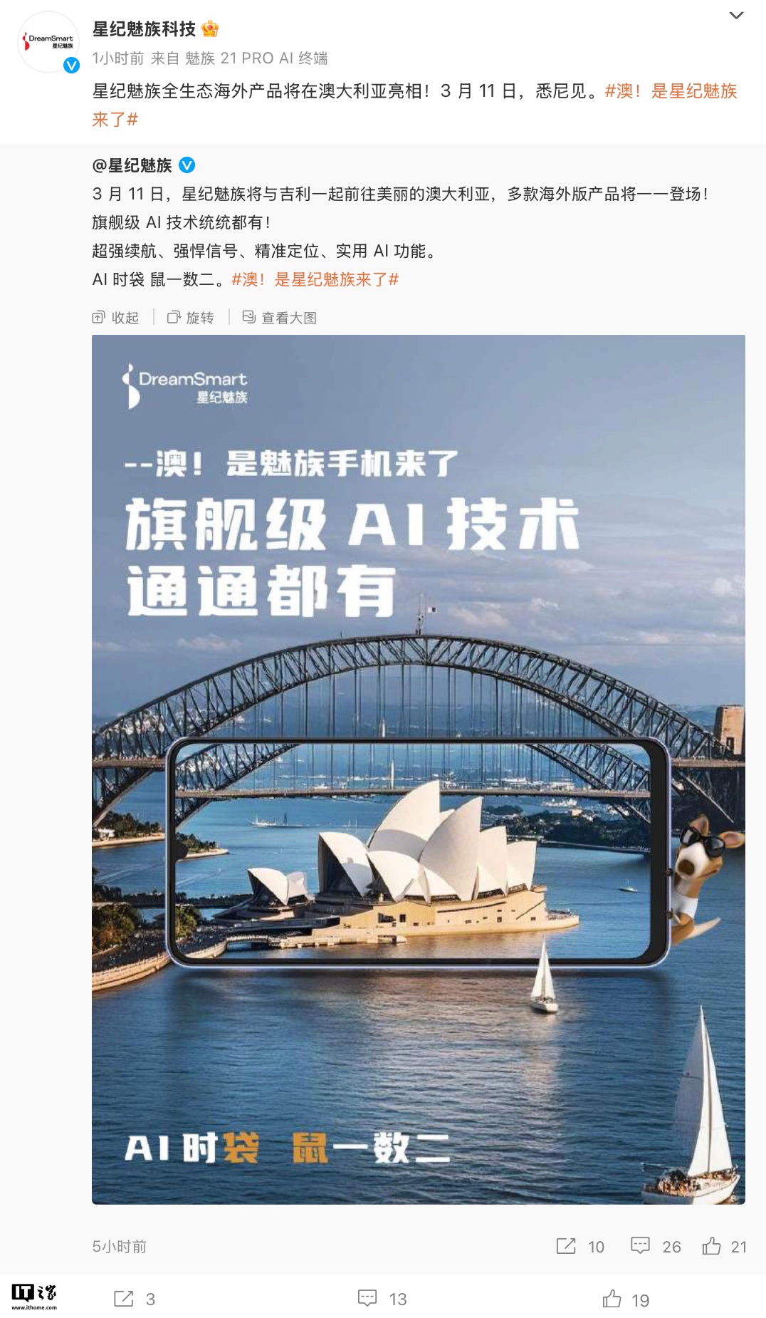 IT之家 3 月 7 日消息,“星纪魅族科技”官方微博发文,宣布将于 3 月 11 日举行发布会,将推出“星纪魅族全生态海外产品”,相应产品将配备“旗舰级 AI 技术”,主打“续航、信号、精准定位、实用 AI 功能”等特性。