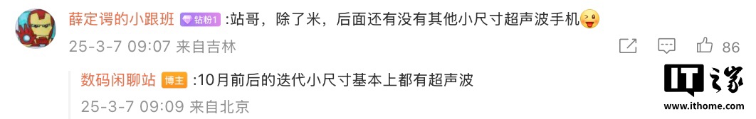 此外,该博主还在评论区透露“今年 10 月前后的迭代小尺寸基本上都有超声波”。