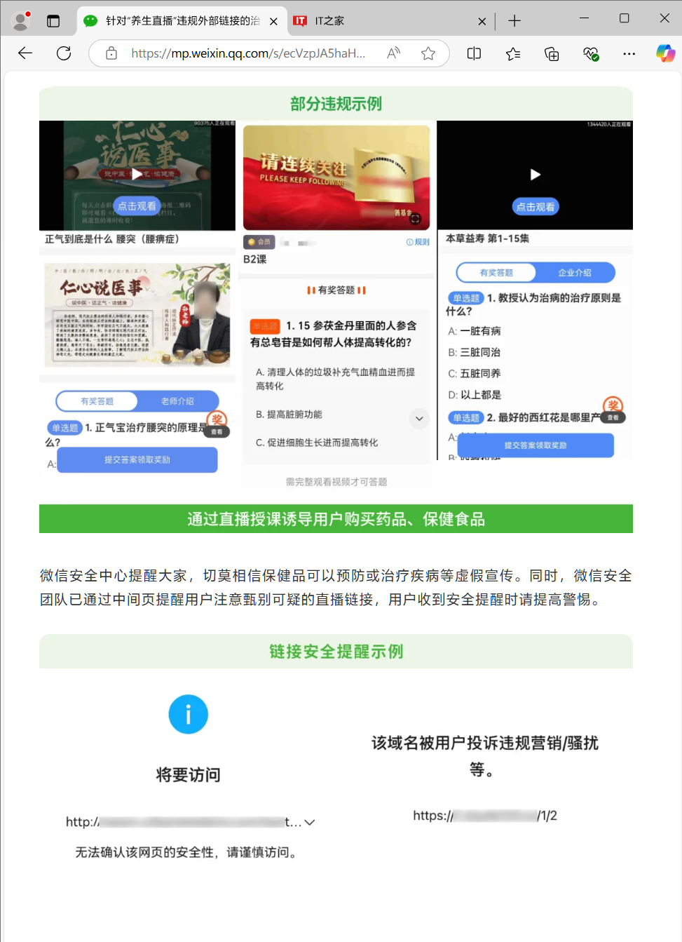 IT之家从官方公告获悉,微信安全中心称,若有关行为经发现核实,平台将依据国家相关法律法规以及《腾讯微信软件许可及服务协议》 《微信个人账号使用规范》 《微信外部链接内容管理规范》等规范进行处理。若外部链接中的直播内容涉及违规发布医疗、药品、保健食品等信息,微信端会限制链接访问,同时平台会结合用户投诉证据加大对此类违规账号的处罚力度。