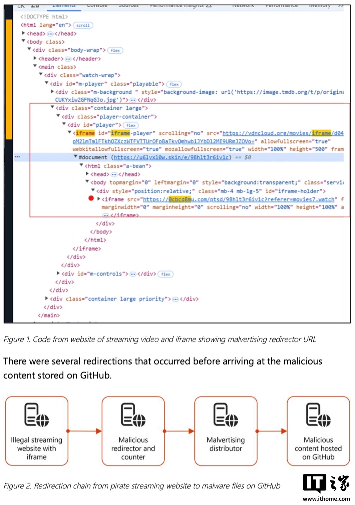 据悉,此次攻击主要通过盗版视频网站传播,相应盗版视频站点嵌入有 iframe 广告,黑客购买相应广告位,并提供恶意链接,导致用户在播放盗版视频时有概率重定向至黑客设置链接,继而引导至 GitHub 等平台下载恶意木马软件,一旦用户下载了相应恶意软件,黑客即可获取用户的系统信息、浏览器中存储的各种凭据。