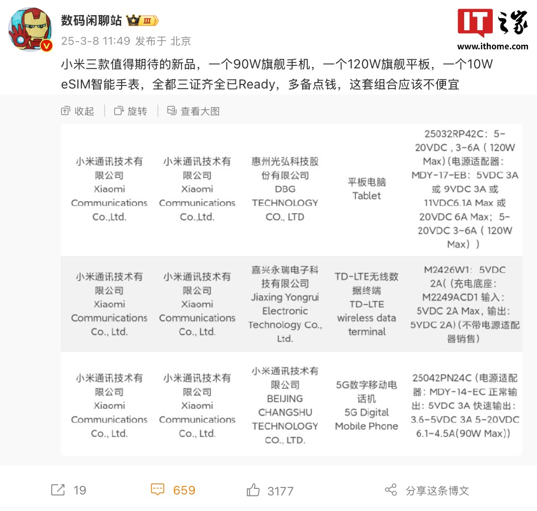 IT之家 3 月 8 日消息,小米旗下三款神秘新品现已获批入网,其中一款为 120W 快充大屏平板、一款为 90W 快充手机、一款为 10W 充电功率的 eSIM 手表。博主 @数码闲聊站 透露这三款设备将同台登场,其中相应 eSIM 手表“签了孙颖莎当代言人”。