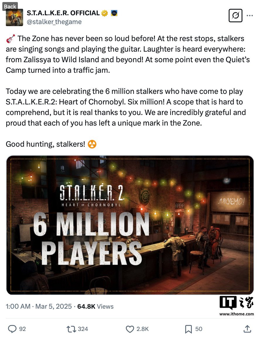IT之家 3 月 8 日消息,开发商 GSC Game World 宣布旗下《潜行者 2:切尔诺贝利之心(S.T.A.L.K.E.R. 2:Heart of Chernobyl)》玩家人数已突破 600 万大关,并感谢了玩家的支持。