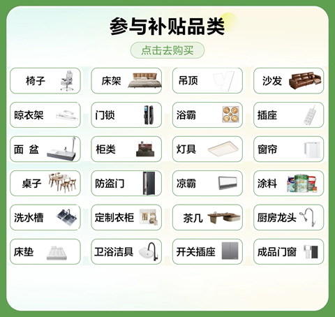 补贴品类包含:成品门窗、涂料、瓷砖、石材、木质地板、板材、吊顶、龙骨、灯具、卫浴洁具、洗水槽、门锁、开关、窗帘、床架、床垫、沙发、茶几、桌子、椅子、柜类、晾衣架、窗帘等部分。京东自营和指定店铺商品。
