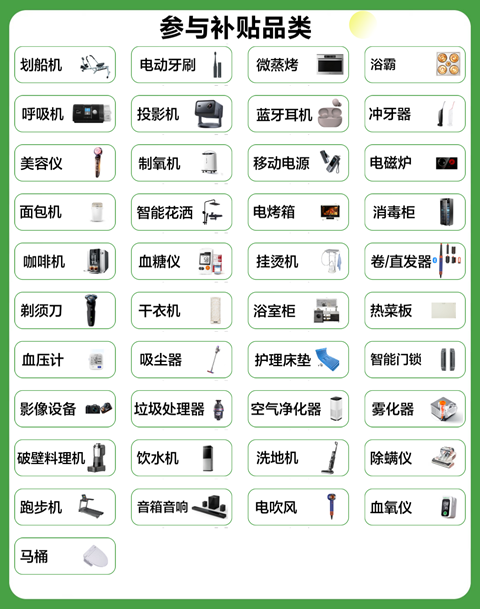 补贴品类包含:干衣机、衣物护理机、电磁炉、电烤箱、电火锅、烹饪机、料理机、面包机、炒菜机器人、饮水机、制冰机、消毒柜、咖啡机、茶吧机、电水壶、空气净化器、投影仪、洗地机、吸尘器、电动垃圾处理器、电风扇、电暖器、除湿机、加湿器、打印机、除螨仪、电吹风、理疗仪、按摩椅、跑步机、浴霸、宠物喂食器、自动猫砂机等 33 类部分京东自营商品。