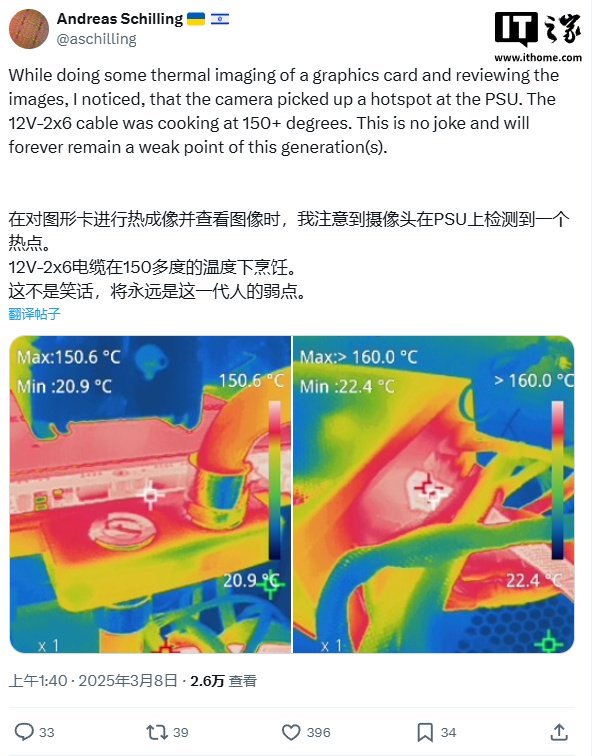 IT之家 3 月 8 日消息,德国媒体 HardwareLuxx 对映众 RTX 5090 Frostbite 水冷显卡进行了压力测试,发现其 12V-2×6 供电接口在电源端温度达到了 150℃,但事后发现线材和插头仍完好无损。