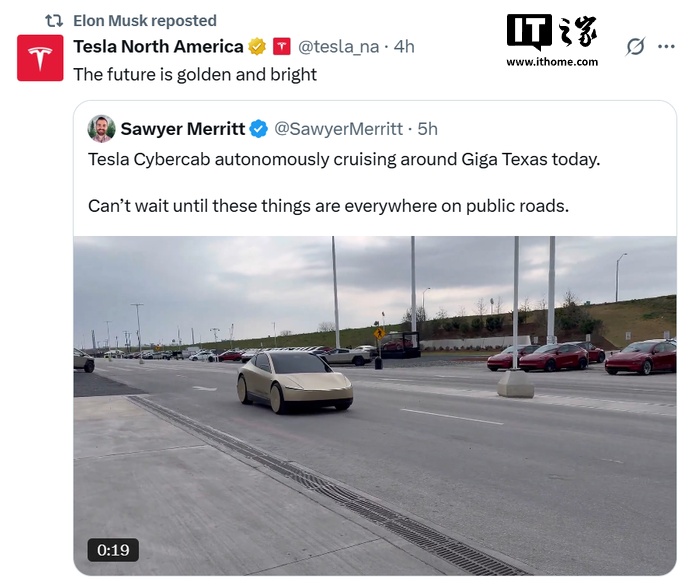 IT之家 3 月 9 日消息,特斯拉 CEO 埃隆・马斯克今日在社交平台 X 上转发了一条关于特斯拉无人驾驶出租车(Cybercab)的贴文,原文称:“特斯拉 Cybercab 今天在得克萨斯超级工厂附近自动驾驶巡游。真等不及这些车遍布公共道路的那一天了。”视频中是一辆金色涂装的特斯拉 Cybercab。
