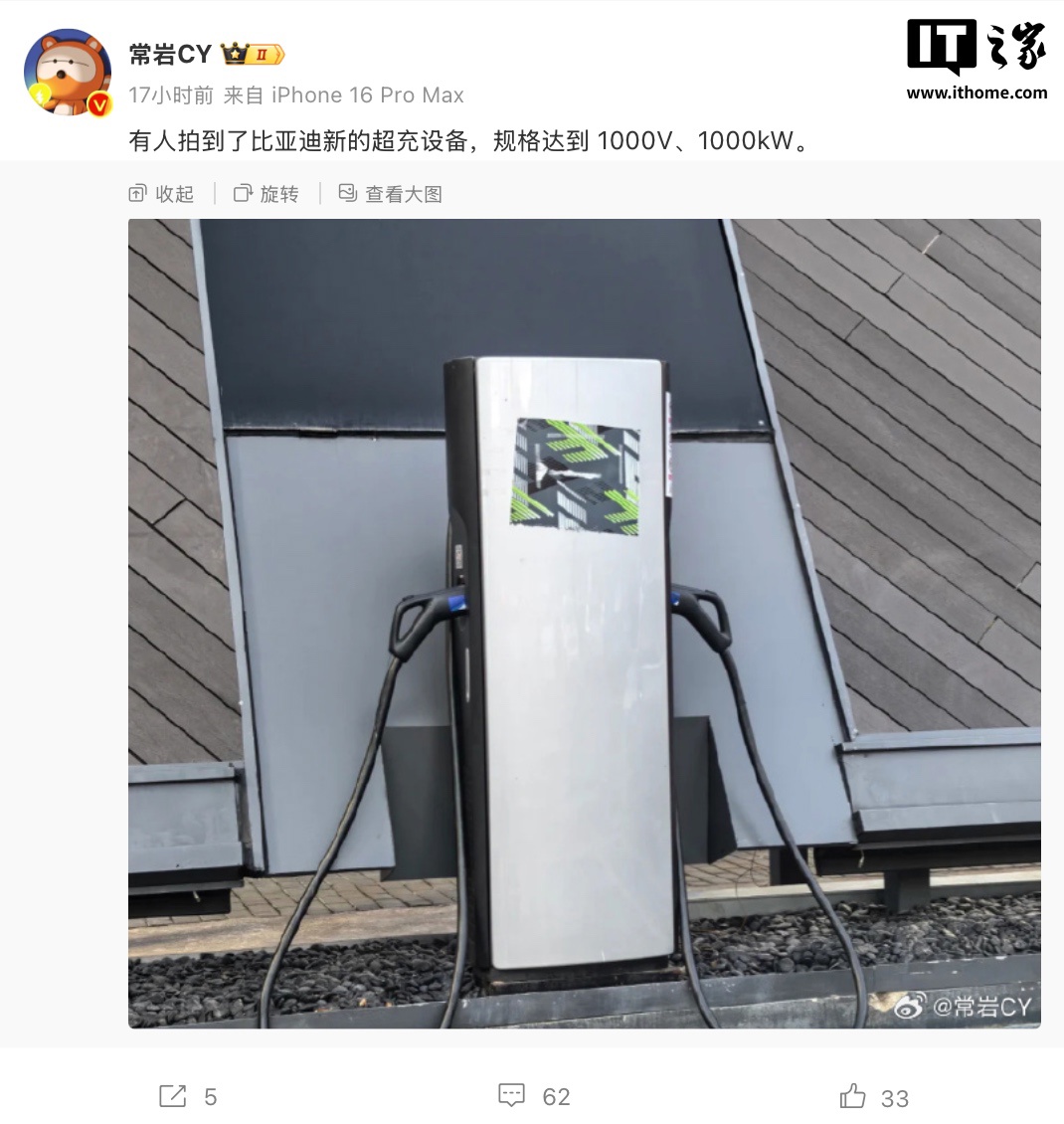 IT之家 3 月 9 日消息,博主 @常岩 CY 在微博发文,展示了一张据称是“比亚迪新款超充设备”的实拍照片,并声称相应设备电压达 1000V,功率达 1000kW。这意味着如果车辆也支持 1000kW 超充速率,100 度的电池包可在 10-15 分钟内充满。