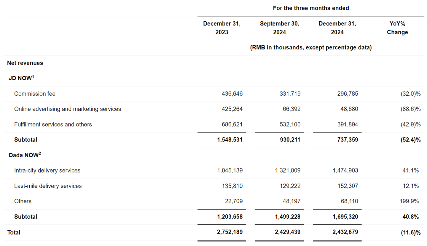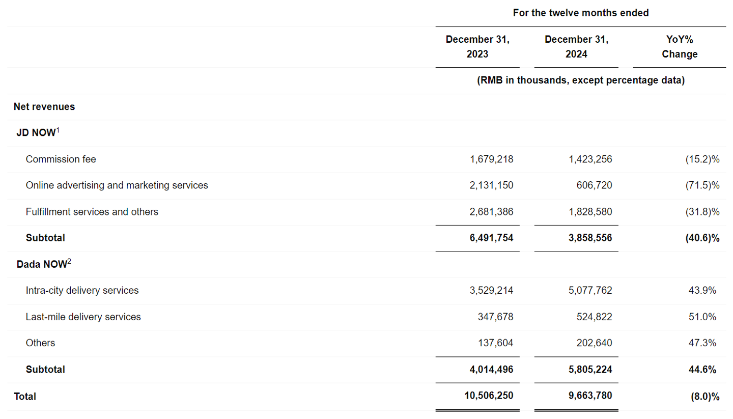 ▲ 即时配送服务的订单量和相应的总营收2024 年,达达集团从 JD NOW(京东秒送)产生的净收入为 38.586 亿元人民币,较 2023 年的 64.918 亿元人民币有所下降,主要由于在线广告和营销服务收入以及履约服务和其他收入下降。