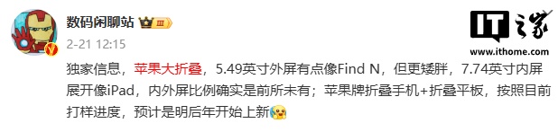 IT之家注意到,目前关于苹果大折叠的配置信息较少。博主 @数码闲聊站 上个月曾爆料,该机采用 5.49 英寸外屏有点像 Find N,但更矮胖,7.74 英寸内屏展开像 iPad,“内外屏比例确实是前所未有”。爆料还称,苹果牌折叠手机 + 折叠平板,按照目前打样进度,预计是明后年开始上新。
