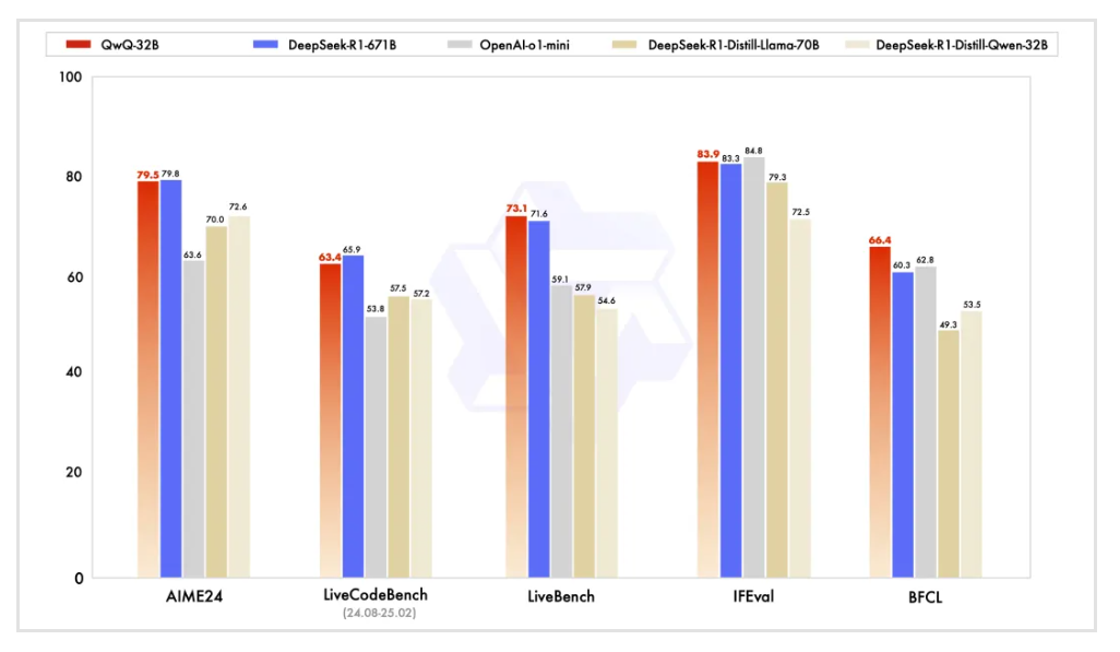 上图展示了 QwQ-32B 与其他领先模型在数学推理(AIME24 评测)、代码生成(LiveCodeBench)、工具调用(BFCL 测试)中的性能对比,QwQ-32B 表现与 DeepSeek-R1 相当,远胜于 o1-mini 及相同尺寸的 R1 蒸馏模型。