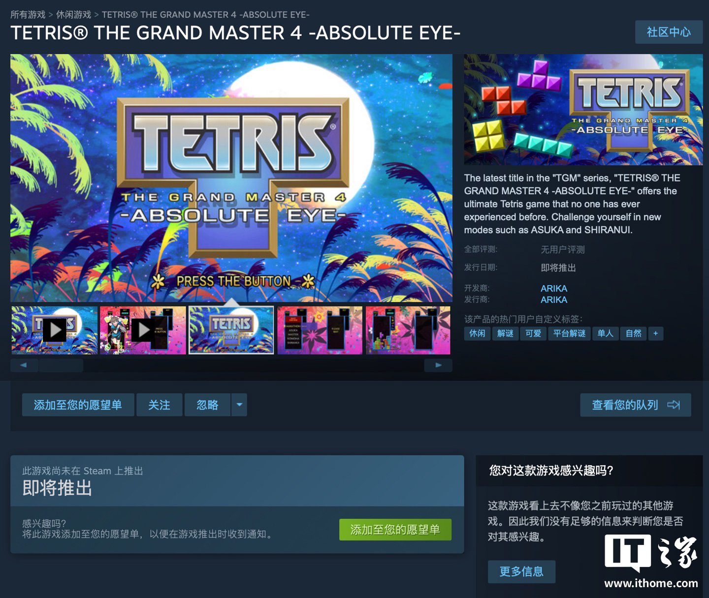 IT之家 3 月 10 日消息,经典游戏续作《俄罗斯方块大师 4(TETRIS THE GRAND MASTER 4 -ABSOLUTE EYE-)》现已上架 Steam 平台,本作距离系列上一代作品《俄罗斯方块大师 3(TGM3)》已有 20 年之久。