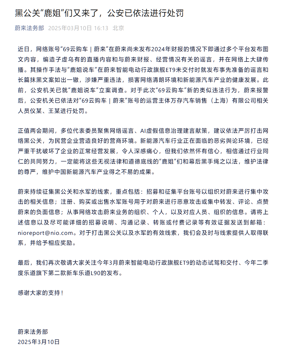 蔚来法务部称,其操作手法与“鹿姐说车”在蔚来智能电动行政旗舰 ET9 未交付时就发布事先准备的谣言和长篇抹黑文案如出一辙,涉嫌严重违法,损害网络清朗环境和新能源汽车产业的健康发展。此前,公安机关已就“鹿姐说车”立案调查。