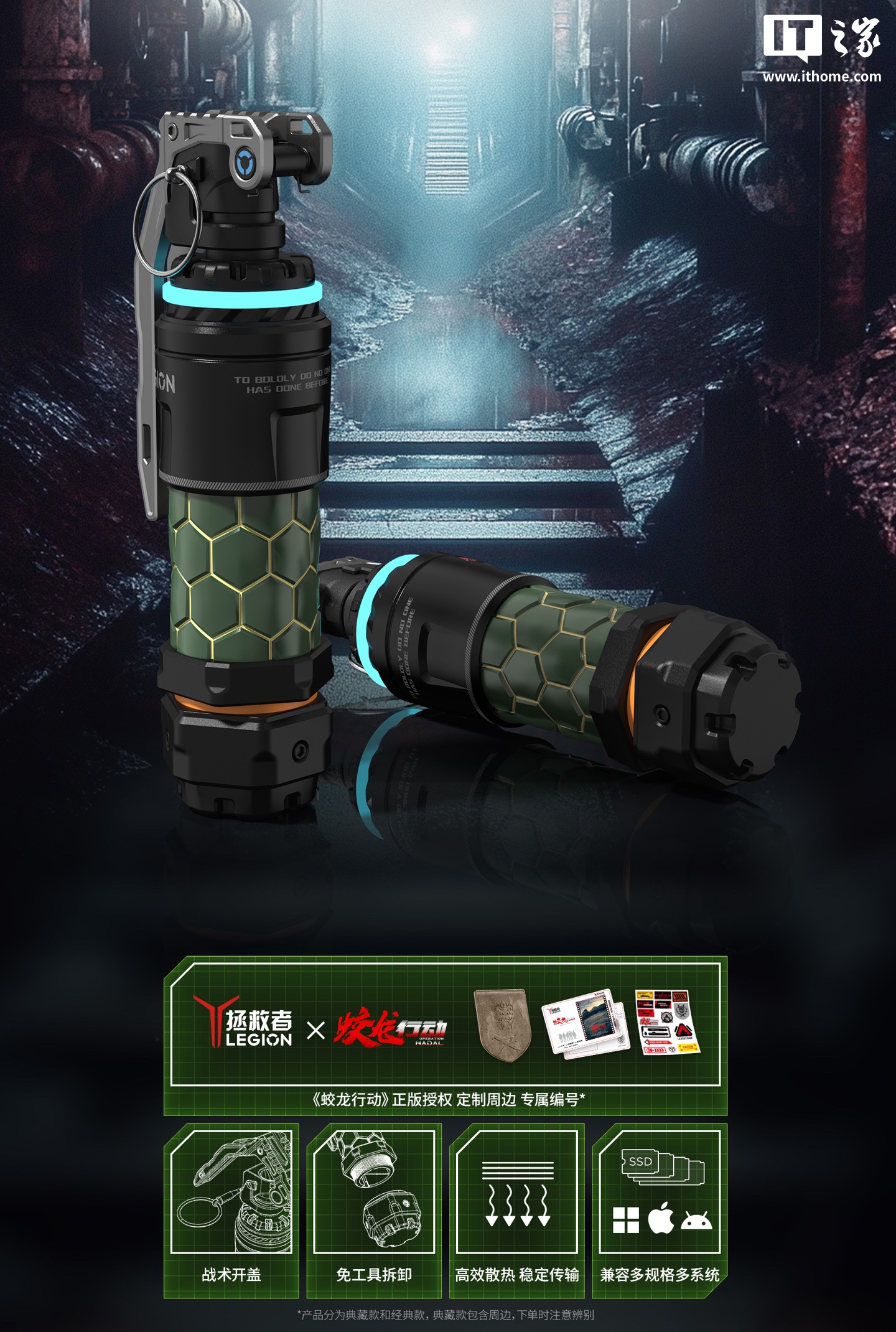 IT之家 3 月 10 日消息,联想旗下“拯救者战术移动固态硬盘”已在其商城开售,这款硬盘主打“手雷造型外观”,为联想拯救者与电影《蛟龙行动》的联名合作产品,可选硬盘盒版(无 SSD)及带有 1TB SSD 的版本。