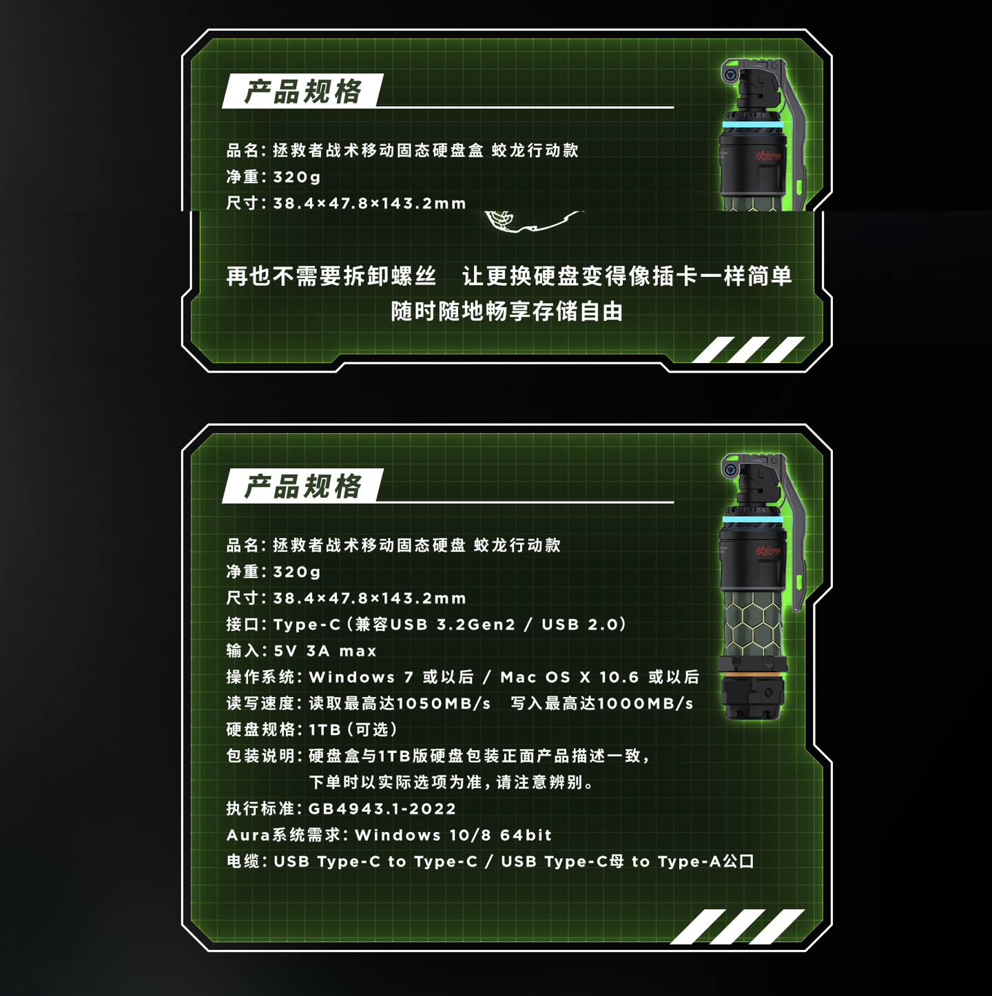 相应固态硬盘盒外观采用铝合金手雷造型,官方称其支持 USB 3.2 Gen 2 协议,兼容多规格 SSD,其中带有 1TB SSD 的版本读速至高 1050 MB/s,写速至高 1000 MB/s,官方未公布该产品是否可上飞机高铁地铁。