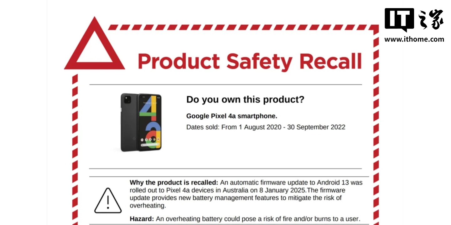 IT之家 3 月 10 日消息,3 月 7 日澳大利亚竞争与消费者委员会(ACCC)的产品安全监管机构发布了一份“项目安全召回”通知,确认谷歌 Pixel 4a 手机的电池性能更新是为了“降低电池过热的风险”。此前谷歌在 1 月宣布 Pixel 4a 电池性能计划时,并未明确说明发布该更新的具体原因,而此次澳大利亚的召回通知揭示了这一更新背后的真正目的。