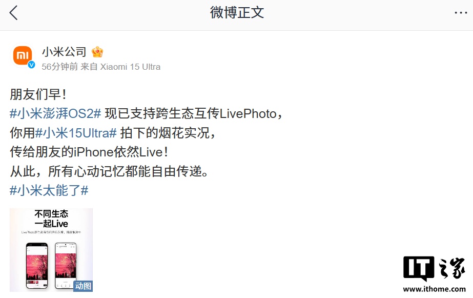 根据官方本月(3 月 7 日)发布的小米澎湃 OS 答网友问(第八集)内容来看:OS 2 新增支持小米手机、小米 Pad 与 iPhone、iPad 互传 LivePhoto 格式动态照片,跨生态互传后保留图片的动态效果。