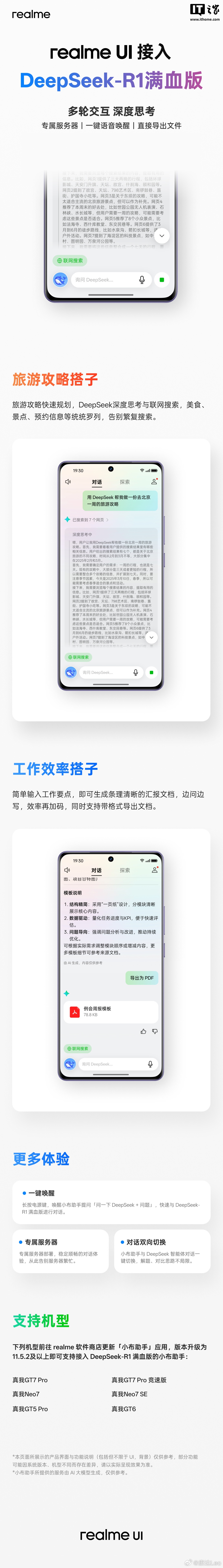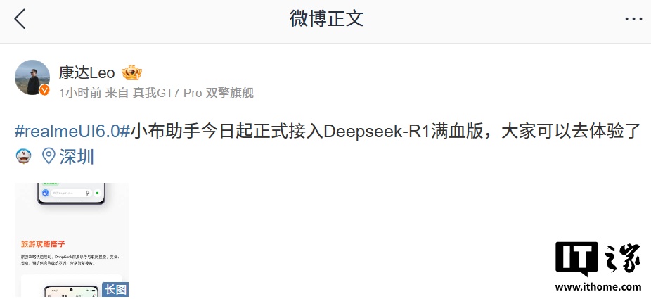 IT之家 3 月 11 日消息,realme UI 产品经理 @康达Leo 今日发文称,真我 realme UI 6.0 系统小布助手今日起正式接入 Deepseek-R1 满血版。
