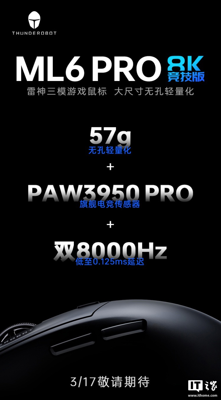 IT之家 3 月 11 日消息,雷神发文,宣布将于 3 月 17 日推出一款雷神 ML6 PRO 8K 竞技版鼠标,主打“大尺寸无孔轻量化”。