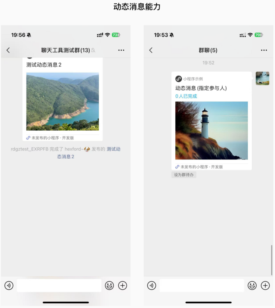 动态消息能力:小程序卡片上的辅标题可以动态更新,在用户完成 / 参与了活动后下发系统消息