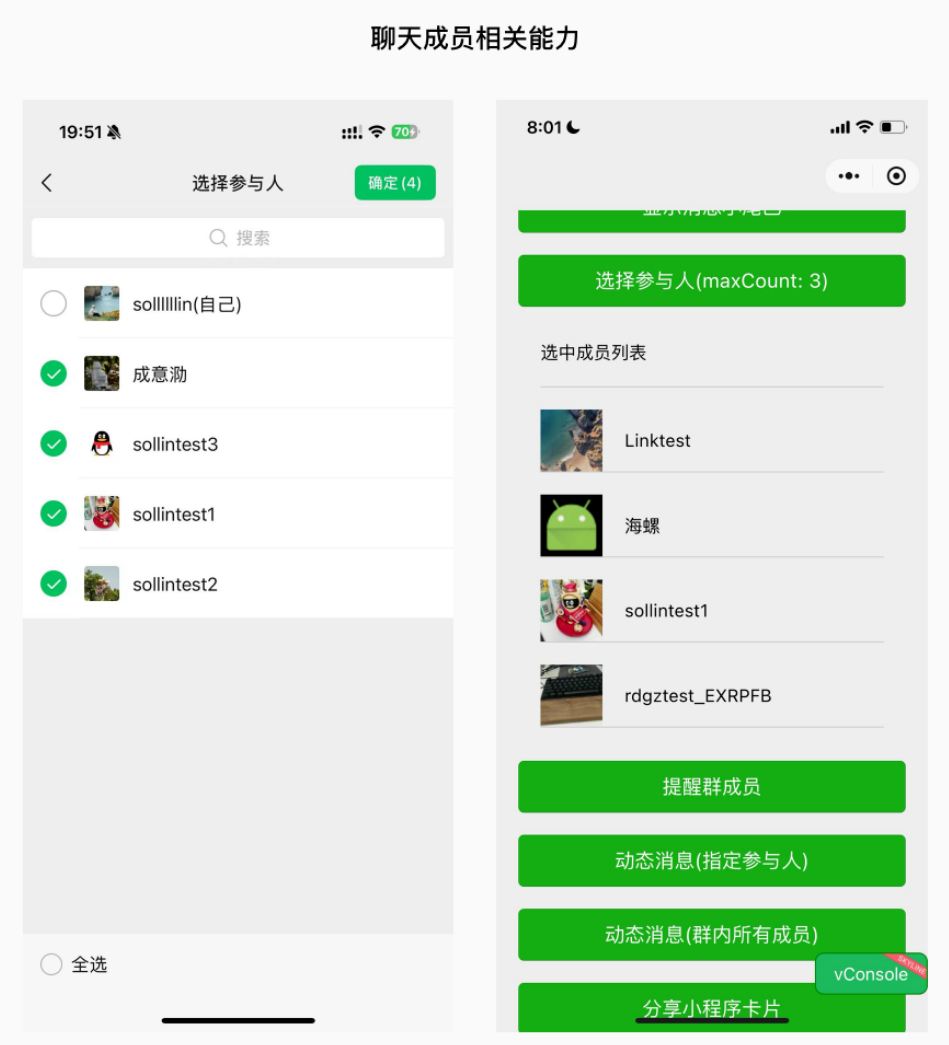 聊天成员相关能力:开发者可调用聊天成员选择器并获取成员相关 id,通过开放数据域渲染聊天成员的头像昵称