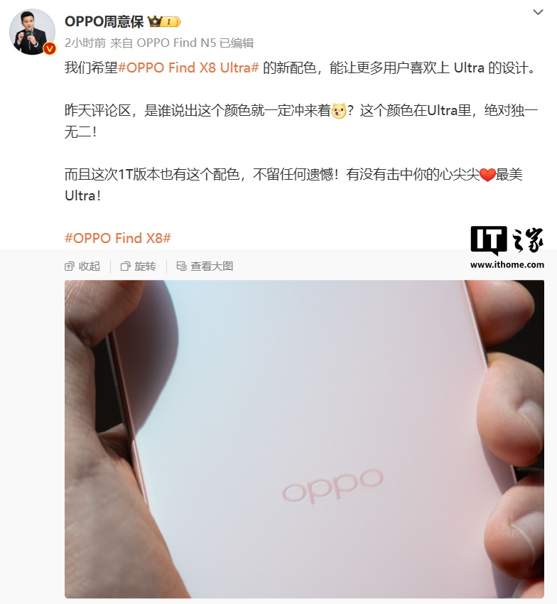 IT之家 3 月 11 日消息,OPPO Find 系列产品负责人周意保今日首次曝光了 Find X8 Ultra 手机的新配色(图片显示类似粉白蓝渐变的效果),并称这次 1T 版本也有这款配色。