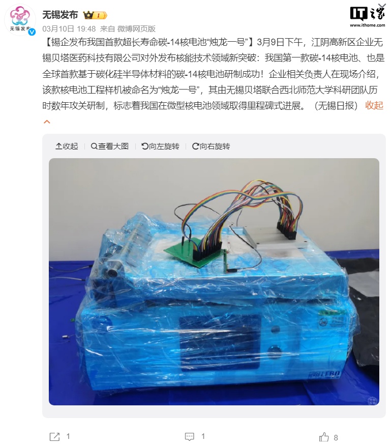 IT之家 3 月 11 日消息,综合无锡日报、江阴发布报道,3 月 9 日下午,无锡贝塔医药科技有限公司联合西北师范大学对外发布核能技术领域新突破:我国第一款碳-14 核电池、全球首款基于碳化硅半导体材料的碳-14 核电池研制成功,理论上可持续放电上千年。