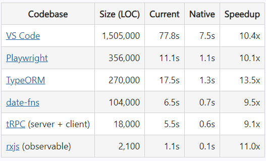 微软官方测试显示,本地实现已经能够加载许多流行的 TypeScript 项目,包括 TypeScript 编译器本身。以下是在 GitHub 上一些不同大小的流行代码库上运行 tsc 的时间: