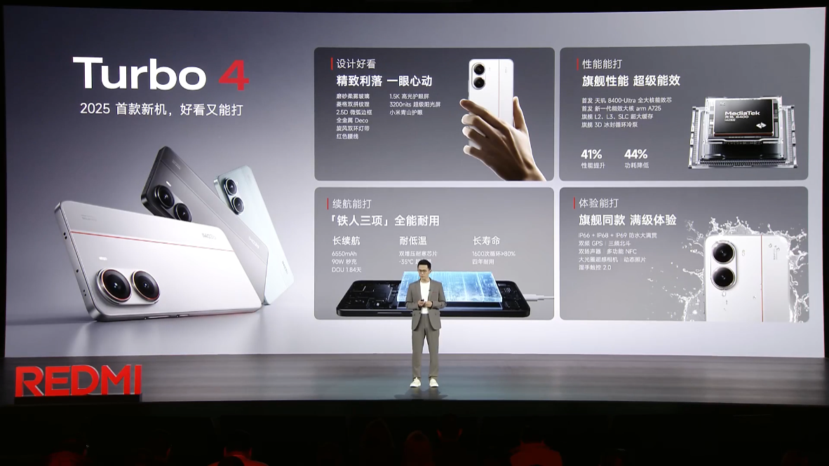 据IT之家此前报道,小米 REDMI Turbo 4 手机于今年 1 月发布,售价 1999 元起。该机首发搭载天玑 8400-Ultra 处理器,采用 2.5D 微弧边框、全金属 Deco,机身正面配备一块 6.67 英寸 2712×1220 柔性 OLED 直屏。