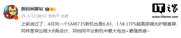 IT之家 3 月 12 日消息,博主 @数码闲聊站 今日爆料称某厂骁龙 8s Elite(SM8735)新机 4 月发布,结合评论区网友推测,这款新机预计为小米 REDMI Turbo 4 Pro。