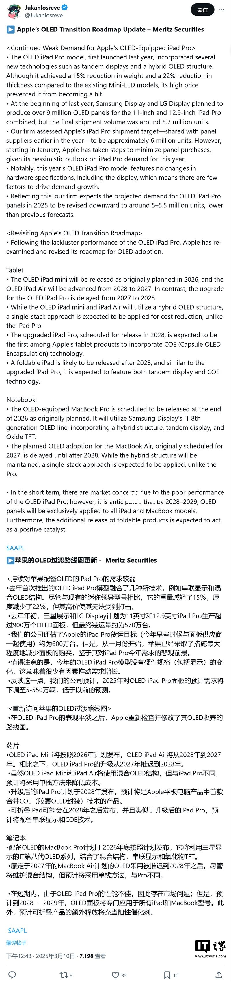 IT之家 3 月 12 日消息,消息源 @Jukanlosreve 于 3 月 10 日在 X 平台发布推文,援引韩国金融公司 Meritz Securities 的最新研报,称由于 OLED iPad Pro 销量未达预期,苹果调整 OLED 路线图,推迟了部分产品的发布时间,并计划延后至 2028 年全面采用 OLED 技术。