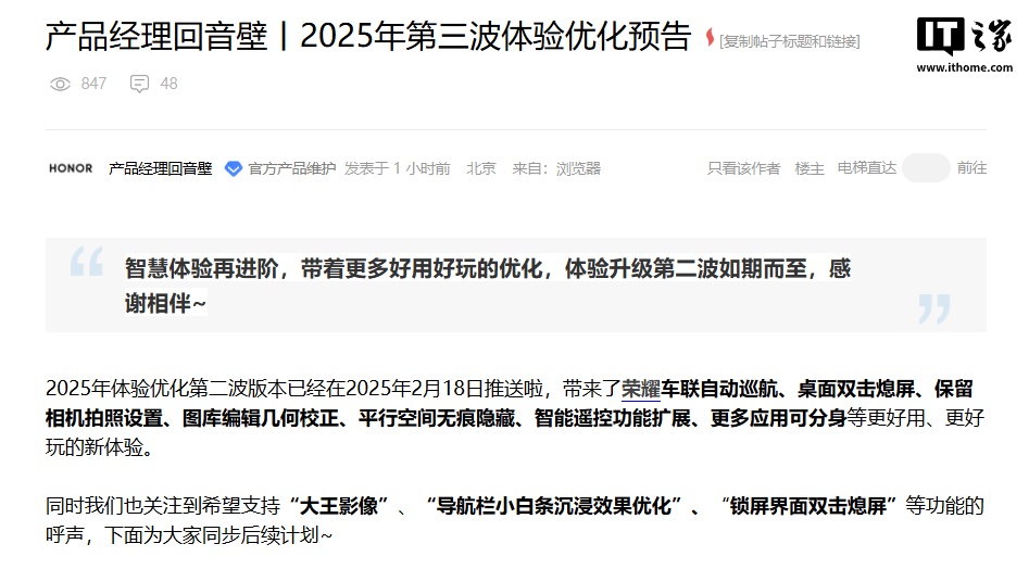据IT之家此前报道,荣耀官方在上月发布了《2025 年第三波体验优化预告》,其中提到: