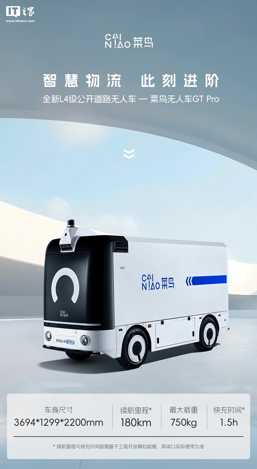 据IT之家此前报道,菜鸟今年发布的 L4 级物流无人车 GT Pro 售价 14.98 万元起。该车尺寸 3694*1299*2200mm,标称续航里程 180km,最大载重 750kg,能够自主规划路线、避让障碍物,在复杂的城市道路环境中安全行驶,为末端站点提供快递运输服务。