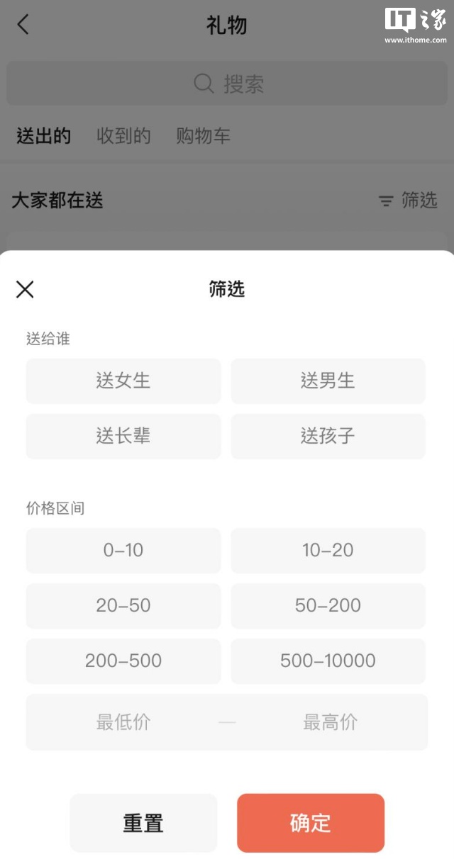 该功能可筛选送礼对象,如:送女生、送男生、送长辈以及送孩子;用户还可根据预算筛选礼品价格,在官方设置的 6 个价格区间中,前 4 个区间均在 200 元以内。