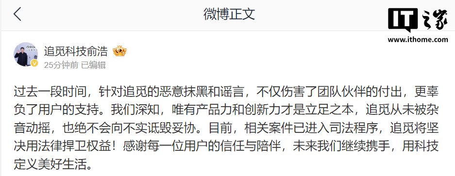 对此,追觅科技创始人兼 CEO 俞浩回应表示,“过去一段时间,针对追觅的恶意抹黑和谣言,不仅伤害了团队伙伴的付出,更辜负了用户的支持。我们深知,唯有产品力和创新力才是立足之本,追觅从未被杂音动摇,也绝不会向不实诋毁妥协。目前,相关案件已进入司法程序,追觅将坚决用法律捍卫权益!感谢每一位用户的信任与陪伴,未来我们继续携手,用科技定义美好生活。”