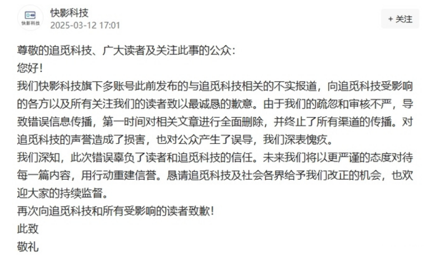 IT之家 3 月 12 日消息,快影科技官方账号今日晚间发布了一则《致追觅科技公开致歉声明》公告,就旗下多账号此前发布与追觅科技相关的不实报道,向追觅科技受影响的各方以及所有关注快影科技的读者致以最诚恳的歉意。